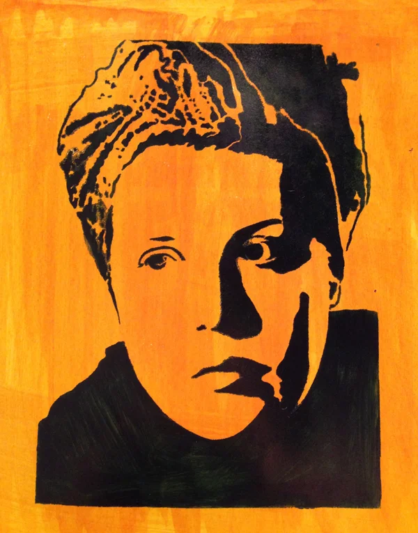 A little fine-tuning. Painted in some details in the eyes and joined some of the stencil breaks with paint.