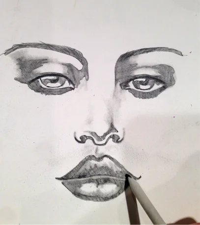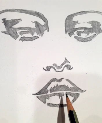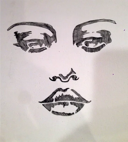 Now go back into your drawing with your pencil, you are going to fill in the missing bits of the gace. The line and shading breaks that you see in the lips and eyes....fill them in. This is an important step to transform the look of the work from an obvious stencil to more of an actual drawing.