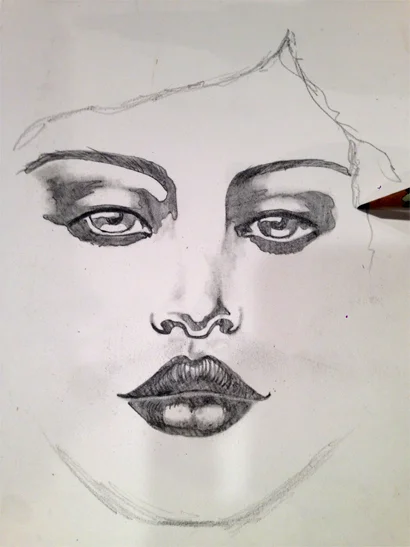 Using your pencil go ahead and draw in the shape of the face, the hairline and neck. Draw lightly so that you can go back and easily erase and modify your lines until you are happy with what you've drawn.