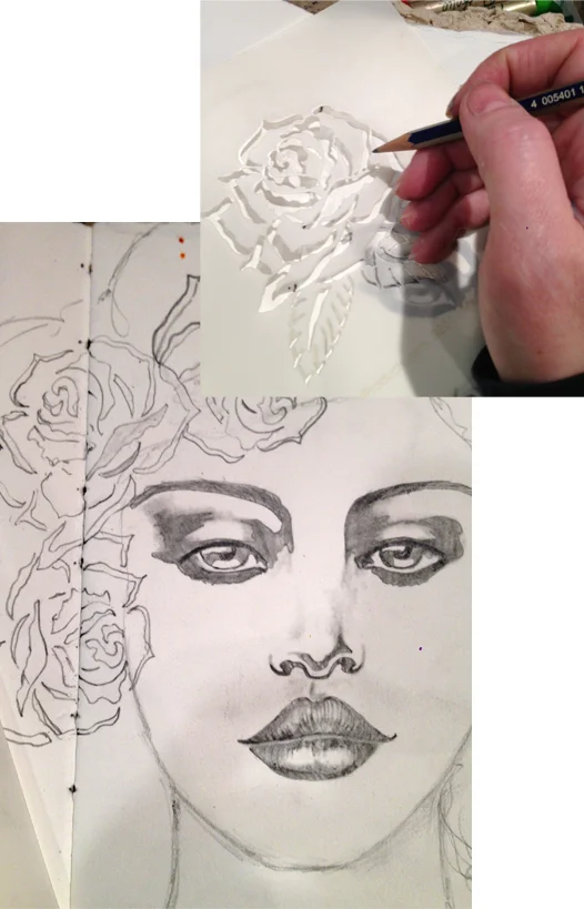 The finishing touches...here I've gone back and repeated all the techniques we've just covered but using my A Rose by any other name, A little Birdie told me and Free as a Bird stencils to add additional details into the headdress and portrait.