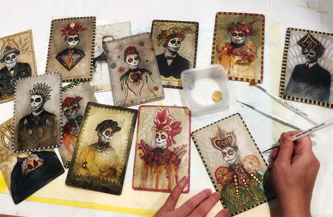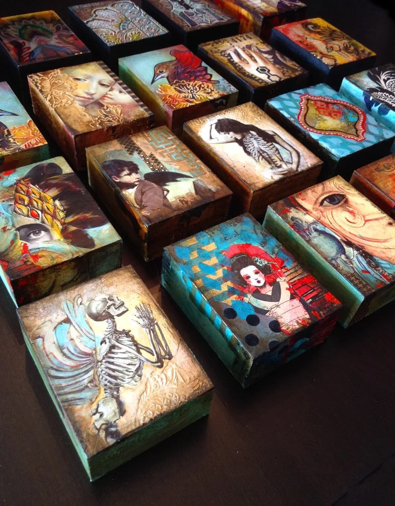 Archetypal Portraiture Muses & Mythos Sacred Relics & Constructs Iconography Allegories of Virtue & Vice Explorations of a Wandering Mind Between Realms Translucent Collage Mental Blocks Urban Abstractions Scrolls Cabinet Card Curiousities For the Love of Books
