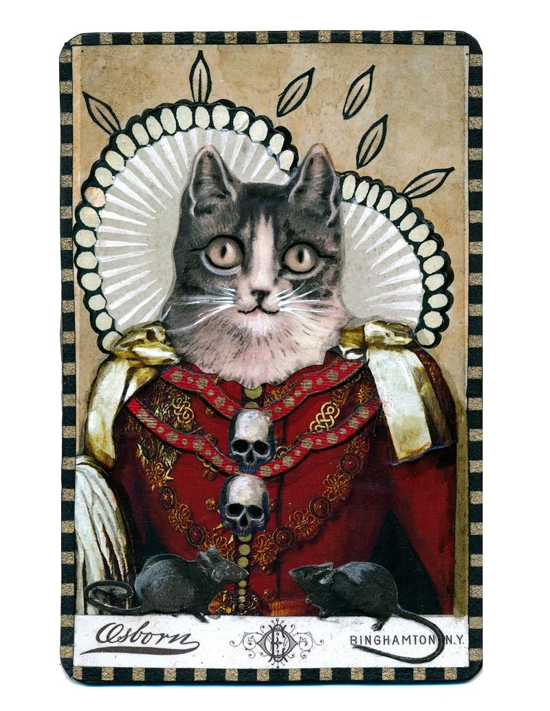 Vintage cabinet cards, once formal and fixed in their purpose, are given new life through collage and paint. This series transforms these small historical artifacts into imaginative works of art, bridging the gap between tradition and the unexpected. The works are currently split into two separate series: “Retratos de los Muertos” & “Anthromorphic Animals”